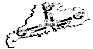 2008年5月29日,广东省委、省政府下发《关于推进产业转移和劳动力转移的决定》。图为广东省产业转移和劳动力转移方向示意图,其中①代表产业转移,②③代表劳动力转移