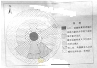 本题解析:由图可知:传统与新兴并存的工业区位于城市西北部,西南和北部都有;城市新开发区主要位于南部和东南部,靠近科研文化区;外来主要分布在轻工业区、商业区周围,近传统工业区和新工业区,主要从事劳动密集型工业;整个城市空间结构形态集中团块状,而不是放射状。