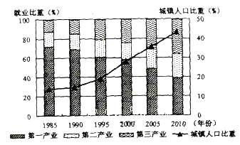 5、单选题 读某省l985-2010年就业结构与城镇人口比重变化。完成下列各题
