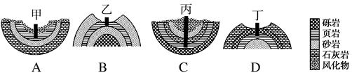 4、单选题 页岩气是一种非常规天然气资源,主要沉积在密闭性较好的页岩层底部,其埋藏条件与常规天然气不同。读下图,甲乙丙丁四地可能勘探到页岩气矿产的是(? )
