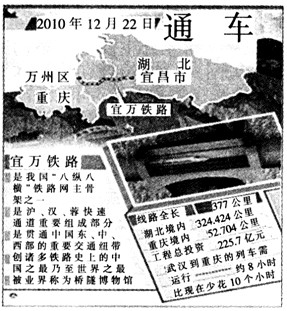 ? 2010年12月22日上午10时,宜万铁路通车仪式在湖北恩施火车站举行,随着恩施至宜昌东4806次列车徐徐开出车站,标志着我国地质条件最为复杂、修建难度最大的铁路宜万线正式通车。这条被誉为中国“西南山区铁路艰险之大成者”的铁路,连接重庆万州与湖北宜昌,总投资225.7亿元,全长377公里,其桥隧比例高达74%,共有隧道159座,被业界称为“桥隧博物馆”。