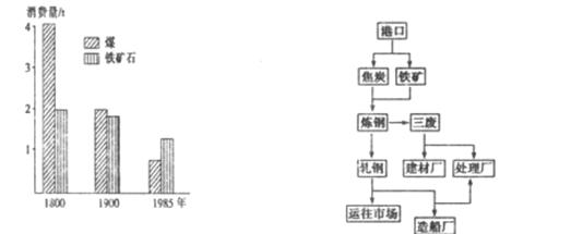 2、单选题 钢铁工业逐步由煤铁复合型向临海型转变,读冶炼一吨钢所消耗煤铁量变化示意图(左).临海型钢铁基地生产流程图(右),回答下列各小题。
