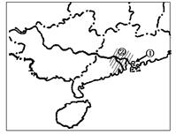 小题1:根据图示,可判断城市①为广东省深圳市,深圳是中国改革开放以来设立的第一个经济特区,是中国改革开放的窗口,已由一个小渔村发展形成现代化国际大都市,所以深圳形成和发展的主导区位因素是国家政策,选择B项。