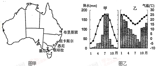 (2)图乙中表示布里斯班气候资料的是      (甲、乙),北京和布里斯班相同的气候特征是                      ,不同的是