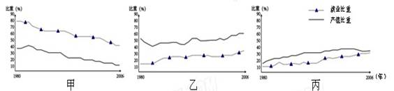 3、单选题 下图中的甲、乙、丙为山东省三次产业产值比重与就业比重变化图,读图,回答下列问题。