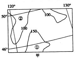 【小题2】甲图中①、②两地无霜期差值T范围是