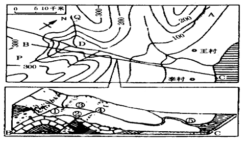 1、综合题 下图为我国东南沿海某区域等高线图及沿BC剖面线的地质剖面图,读图回答下列问题。(14分)