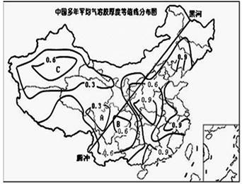1、单选题 气溶胶是大气中悬浮的液态或固态微粒的总称,是大气的重要组成部分。就其来源可分为人为气溶胶和自然气溶胶两种。气溶胶光学厚度(AOD)通常用以推算气溶胶含量。读中国多年平均气溶胶厚度等值线分布图,回答下列各题。