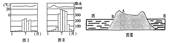 1、综合题  图Ⅰ、图Ⅱ分别是图Ⅲ中A、B两地的气温曲线和降水柱状图,图Ⅲ为北纬20°某地区的地形剖面图。读图回答: (9分)