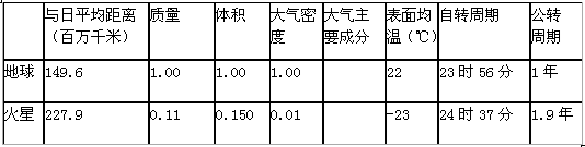 5、单选题 我国与俄罗斯合作共同开展火星探测活动,首个火星探测器——“萤火一号”于2009年10月搭乘俄罗斯火箭发射升空。读地球与火星的相关资料,回答下列各题。