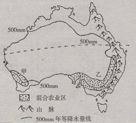小题1:图示乙混合农业区位于大分水岭的西侧,为东南季风的背风坡,降水少,故水源不足。