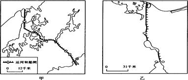 小题1:由图可知,甲、乙两图所示分别为巴拿马运河和苏伊士运河,甲、乙两图运河地区的自然景观分别是热带雨林景观和热带荒漠景观,所以答案为A。