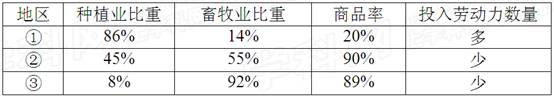 1.直接根据表格资料判断,①地区以种植业为主,商品率低,投入的劳动力多,故判断为水稻种植业地区。