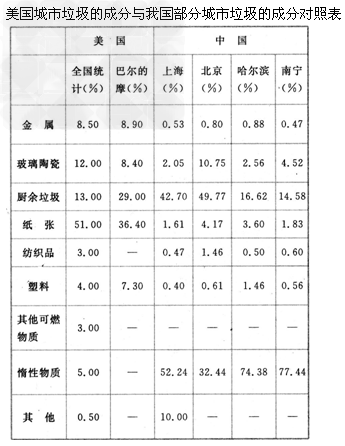 (2)由表中内容可以看出,中国和美国的城市生活垃圾成分有很大区别,美国垃圾的______物质较多,可___________的成分较高,而美国一般采取的处理方式为焚烧,这种处理方式产生的环境问题是______________________________。