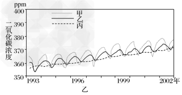 材料三:乙图是造成地球温室效应的二氧化碳在台湾岛、关岛、南极大陆三个地区从1993年4月到2002年12月浓度变化图。