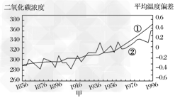 材料二:二氧化碳浓度变化与大气平均温度偏差的相关性(甲图)。