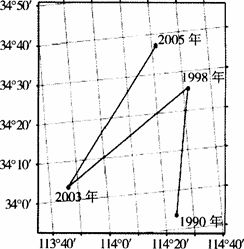 材料三 图是1990~2005 年中国粮食产量重心轨迹示意图。