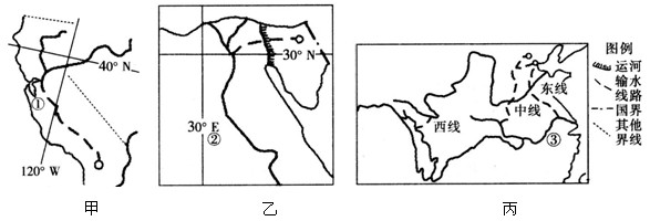 (1)甲为______国的北水南调工程;乙为埃及的西水东调工程;丙为______国的____________工程。上述工程主要是解决其所在国家的__________________________________________问题。