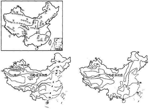 1、综合题 以下分别是我国山脉分布图及1月与7月气温分布图,回答下列问题:(26分)