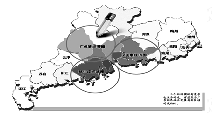 材料一:《珠江三角洲地区改革发展规划纲要(2008-2020年)》规划的“广佛肇”、“珠中江”和“深莞惠”三个经济圈如下图: