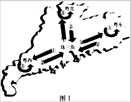 ? 2008年5月,广东省委、省政府下发《关于推进产业转移和劳动力转移的决定》,部署全省进一步推进“双转移”工作,促进广东区域经济协调发展。图1 为广东省产业转移和劳动力转移方向示意图。