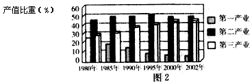 (2)根据图2,说明1980—2002年珠江三角洲地区产业结构的变化趋势。