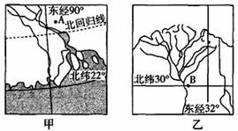 1.结合两地的经纬度位置和河流轮廓判断,甲表示恒河入海口,受热带季风气候影响,乙表示尼罗河河口,受地中海气候影响;河口三角洲均为流水沉积作用而形成的。故选D项。