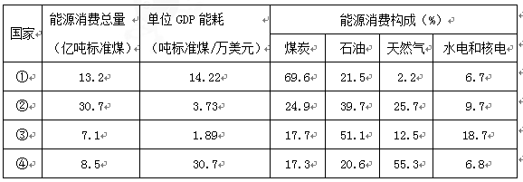 1.表中数据表明2.①-④所代表的国家依次是3.人均消费能源较为相近的一组是