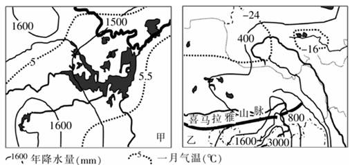 小题1:读图,根据水系形状特征判断甲地洞庭湖水系,乙是青藏高原地区。所以从自然条件看,甲是鱼米之乡,产业是水稻种植业,乙是独特的高原气候,适宜发展高寒畜牧业,D对。A、B、C错。