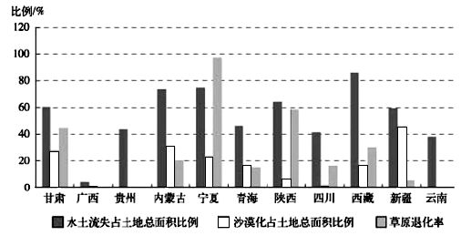 3、单选题 读“我国西部各省区土地及草地退化状况比较图”(图11)