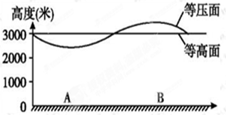 (1)A点对应的高空等压面向下凹,说明高空中为低压,A点为高压(高空中气压值和对应点的气压值相反),是由于气温低,空气收缩下沉而形成高压。相反,B地空气受热(气温高)膨胀上升形成低压。