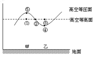 【小题1】根据气压变化规律,在竖直方向上,海拔升高,气压降低。⑤、②、④位于同一等压面上,气压相同,A错。①、②、③海拔高度相同,气压不同,B错。①比⑤海拔低,气压高。③比④海拔高,气压低,所以图示点中,气压①点最高,③点最低,C错。近地面气压与高空相反,所以近地面气压甲地<乙地,D对。