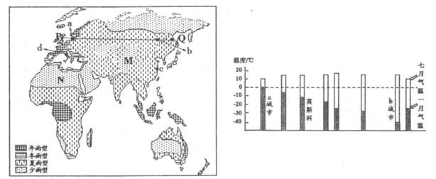 5、综合题 下面左图为世界部分地区降雨分布图,右图为沿PQ—线一月和七月气温柱状图,据此回答下列问题。(13分)