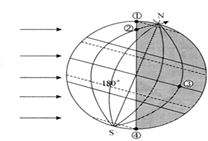 3、综合题 (12分)该图中阴影部分表示黑夜,横线箭头代表太阳光线。读图回答