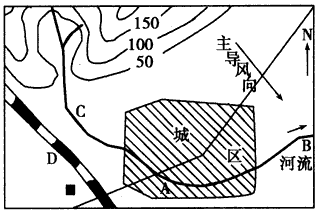 4、综合题 下图所示是某城市布局规划图,要在A、B、C、D四地区建火力发电厂、自来水厂、印染厂、服装厂,并在城郊建立副食品基地及进行绿化建设,从经济效益、环境因素考虑,回答下列问题。