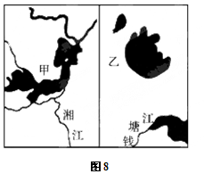本题解析:1.甲是全国洞庭湖,湖泊面积萎缩,导致对河流的调节能力减小,洪涝灾害增多。选择D项。