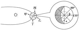 小题1:根据右图可知,这是一幅从极点上空观察的俯视图,可能是从丙或丁处观察到的;再根据此时极圈内发生了极昼现象可知,这必定是从丁处观察的结果。