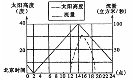 图是“70°N某地24小时内太阳高度和该地某河流量变化示意图”,回答下列各题。