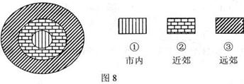 2、单选题 都市农业是一种属于都市、服务于都市的全功能大农业,它在给都市提供物质食品的同时,又提供“精神食品(观光、娱乐、休闲……)”,根据“都市农业”的特点(图8),在都市农业模式的3个农业圈中,布局最合理的一组是