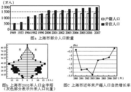 本题解析:(1)直接根据图a判断,注意户籍人口增长不大反映人口自然增长率不大,而常住人口不断上升,反映为人口迁入的影响。(2)直接根据图示b的外来人口的比重主要集中于年轻人口部分,人口迁入既为迁入地提供了大量廉价劳动力、促进资源开发、城市建设和经济发展等,但也会给城市环境造成巨大压力。(3)直接根据图示分析,目前上海市人口基数大,且老年人口比重高,故反映老龄化较严重。建议应主要从促进经济的发展,增加就业和加强社会养老保障制度建设等方面分析。