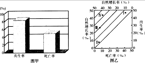 1、单选题 ? 图甲表示“我国2008年某市人口出生率和死亡率”,图乙为“我国不同阶段人口增长状况图”,读图回答1—3题。