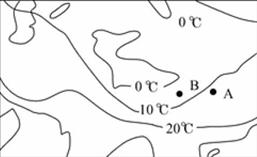 3、单选题 读下侧世界某区域年平均气温分布图,图中A、B在同一纬度的陆地上,下列说法正确的是: