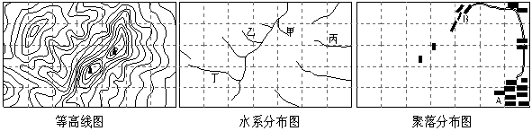 1、单选题  下图为同一地区等高线,水系分布,聚落分布图,读图,完成1—2题。