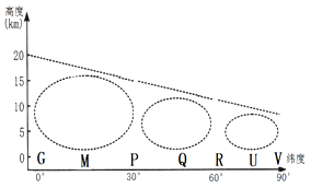 【小题1】据图可知:G位于赤道附近,由于热量充足,气体受热体积膨胀,盛行上升运动,形成低气压带;P位于副热带地区,由于气体在高空一定高度处积聚,最终盛行下沉运动,近地面形成高气压带;R位于副极地地区由于来自高低纬度性质不同的两支气流在此交汇,气体被迫盛行上升运动,形成低气压带;V位于极地地区,由于纬度高,接受太阳辐射的热量少,气候寒冷,体积收缩盛行下沉运动,近地面形成高气压带,所以本题D正确。