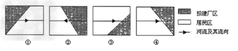 3、单选题  某城镇盛行东南风,拟建一化工厂(如图示意),下列布局方案较为合理的是