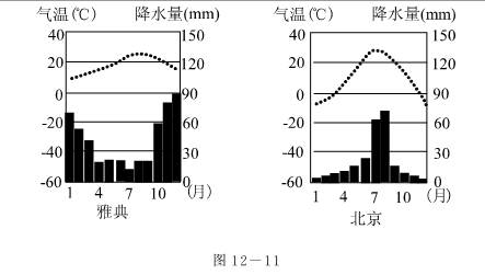 2、单选题 2004年和2008年夏季奥运会分别在雅典和北京举行,图12-11是两地的气候资料。读图完成1-2题。