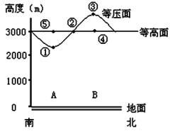 (1)本题考查等压面上气压大小的判断。根据气压变化的特征可知,海拔越高,气压越低。所以④位于等压面以下,气压最大。⑤位于等压面以上,气压最小。其余三点位于统一等压面上,气压相等。