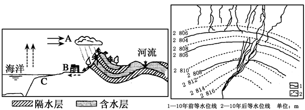 5、综合题 下面左图为某地地形剖面示意图,右图为该地沿海某流域地下水等水位线分布示意图。读图回答下列问题。(18分)