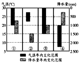 3、单选题 读“几种气候的气温和降水量年内变化范围图”,完成1—2题。