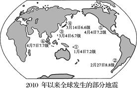 材料一:2010年以来世界上发生了一系列强烈地震,图中显示了其中六次大地震的时间、地点和震级。